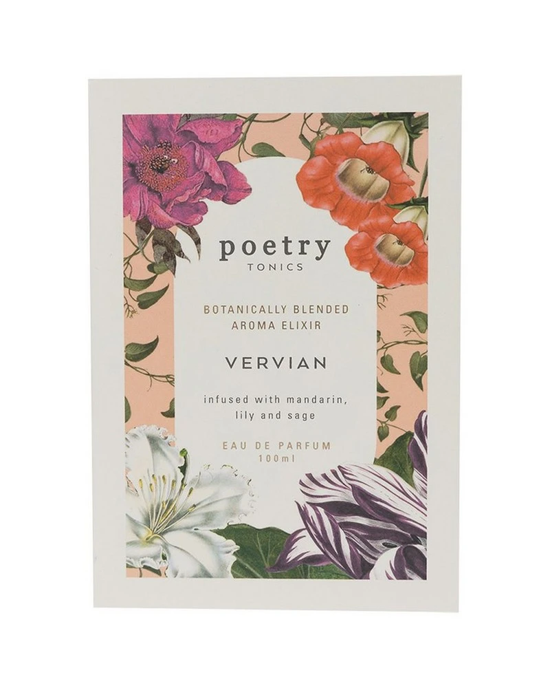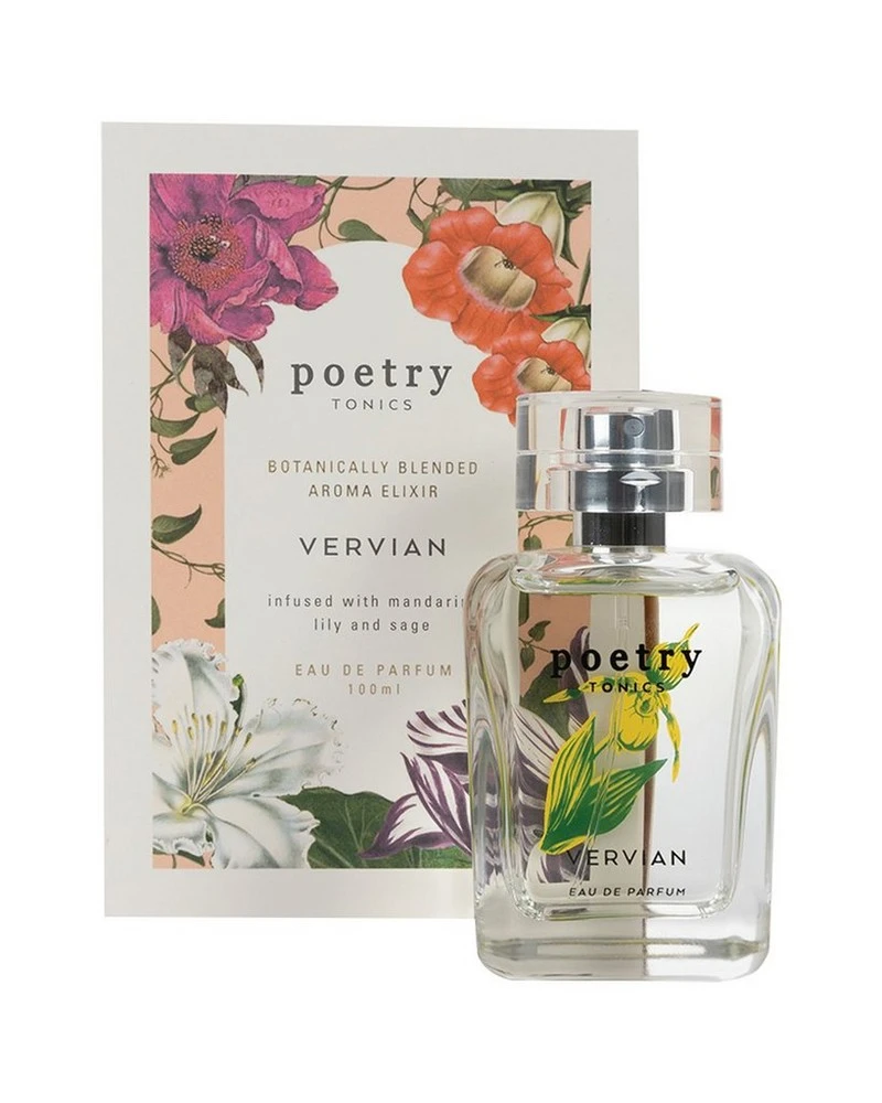 The Vervian Tonic by Poetry is a botanically blended aroma elixir with feminine aromas. It is infused with mandarin, lily and sage to create an eau de parfum that is the ultimate in fun-loving whimsy.