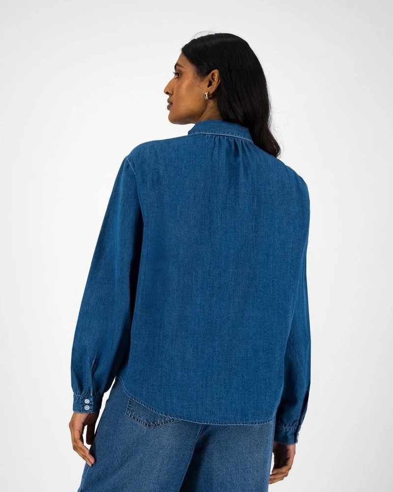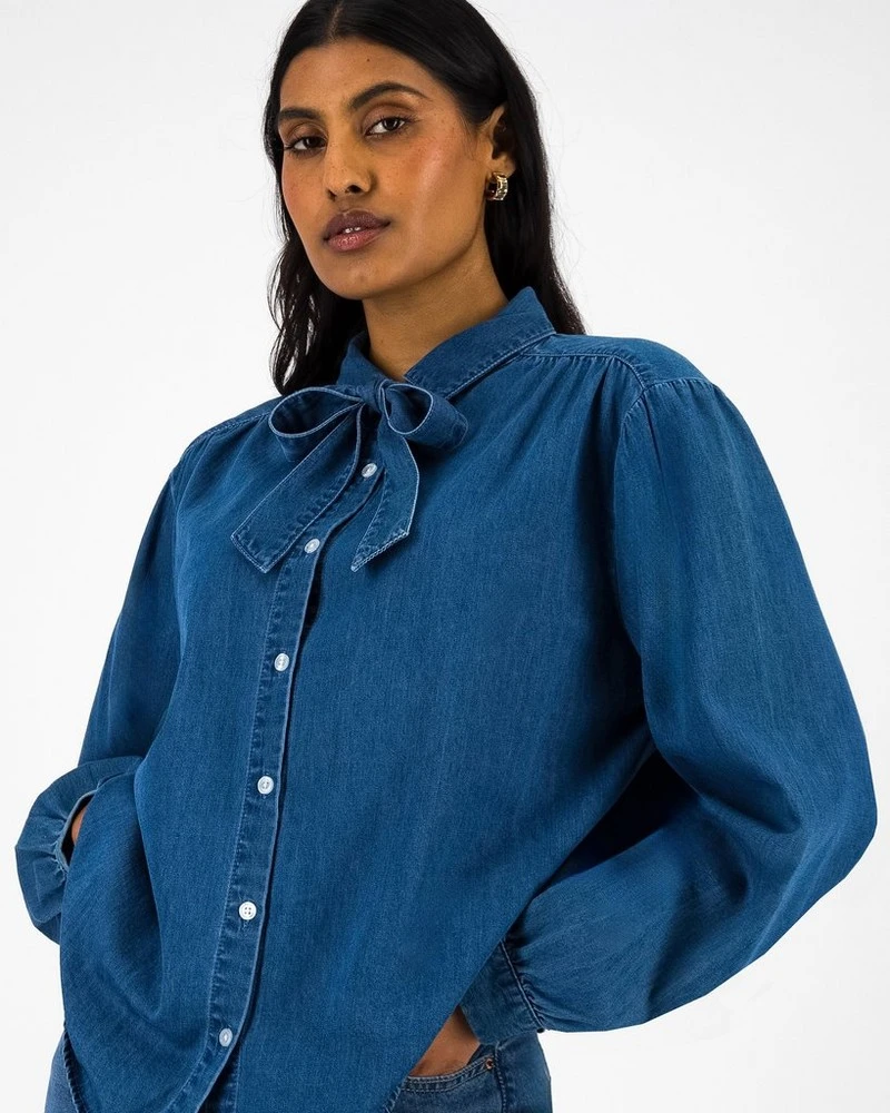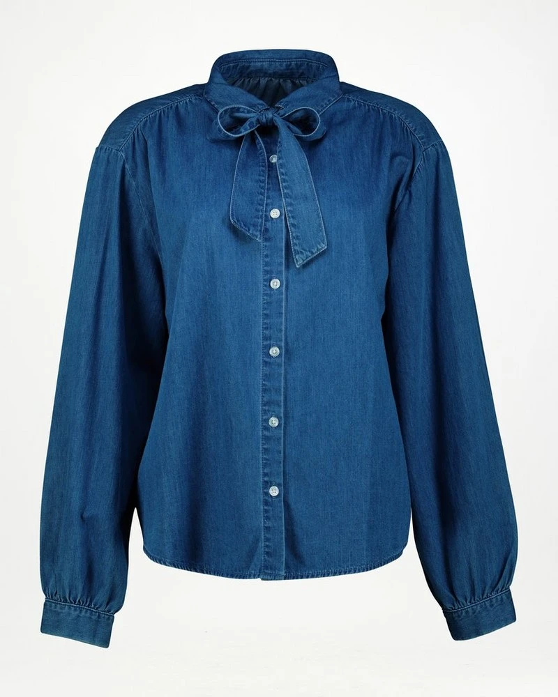 The Zuria Denim Shirt is a classic piece that got a romantic upgrade. Made from 100% cotton, its lightweight that makes it ideal for layering while the detachable kitty bow adds versatility and femininity to the piece.Â